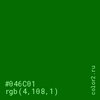 Цвет #046C01 в цветовой модели RGB обозначается тремя октетами (4, 108, 1) в десятичном формате и #046C01 в шестнадцатиричном (hex) формате, которые являются интенсивностью красного 4 (hex 04), интенсивность зелёного 108 (hex 6C) и интенсивность синего 1 (hex 01).