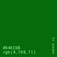 Цвет #046C0B в цветовой модели RGB обозначается тремя октетами (4, 108, 11) в десятичном формате и #046C0B в шестнадцатиричном (hex) формате, которые являются интенсивностью красного 4 (hex 04), интенсивность зелёного 108 (hex 6C) и интенсивность синего 11 (hex 0B).