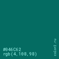Цвет #046C62 в цветовой модели RGB обозначается тремя октетами (4, 108, 98) в десятичном формате и #046C62 в шестнадцатиричном (hex) формате, которые являются интенсивностью красного 4 (hex 04), интенсивность зелёного 108 (hex 6C) и интенсивность синего 98 (hex 62).