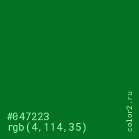 Цвет #047223 в цветовой модели RGB обозначается тремя октетами (4, 114, 35) в десятичном формате и #047223 в шестнадцатиричном (hex) формате, которые являются интенсивностью красного 4 (hex 04), интенсивность зелёного 114 (hex 72) и интенсивность синего 35 (hex 23).