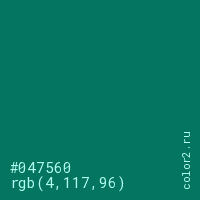Цвет #047560 в цветовой модели RGB обозначается тремя октетами (4, 117, 96) в десятичном формате и #047560 в шестнадцатиричном (hex) формате, которые являются интенсивностью красного 4 (hex 04), интенсивность зелёного 117 (hex 75) и интенсивность синего 96 (hex 60).
