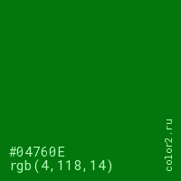 Цвет #04760E в цветовой модели RGB обозначается тремя октетами (4, 118, 14) в десятичном формате и #04760E в шестнадцатиричном (hex) формате, которые являются интенсивностью красного 4 (hex 04), интенсивность зелёного 118 (hex 76) и интенсивность синего 14 (hex 0E).