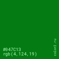 Цвет #047C13 в цветовой модели RGB обозначается тремя октетами (4, 124, 19) в десятичном формате и #047C13 в шестнадцатиричном (hex) формате, которые являются интенсивностью красного 4 (hex 04), интенсивность зелёного 124 (hex 7C) и интенсивность синего 19 (hex 13).
