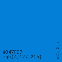 Цвет #047FD7 в цветовой модели RGB обозначается тремя октетами (4, 127, 215) в десятичном формате и #047FD7 в шестнадцатиричном (hex) формате, которые являются интенсивностью красного 4 (hex 04), интенсивность зелёного 127 (hex 7F) и интенсивность синего 215 (hex D7).