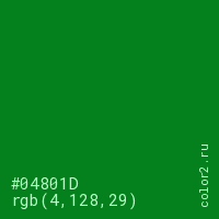Цвет #04801D в цветовой модели RGB обозначается тремя октетами (4, 128, 29) в десятичном формате и #04801D в шестнадцатиричном (hex) формате, которые являются интенсивностью красного 4 (hex 04), интенсивность зелёного 128 (hex 80) и интенсивность синего 29 (hex 1D).