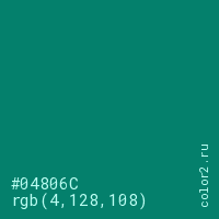 Цвет #04806C в цветовой модели RGB обозначается тремя октетами (4, 128, 108) в десятичном формате и #04806C в шестнадцатиричном (hex) формате, которые являются интенсивностью красного 4 (hex 04), интенсивность зелёного 128 (hex 80) и интенсивность синего 108 (hex 6C).