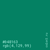 Цвет #048163 в цветовой модели RGB обозначается тремя октетами (4, 129, 99) в десятичном формате и #048163 в шестнадцатиричном (hex) формате, которые являются интенсивностью красного 4 (hex 04), интенсивность зелёного 129 (hex 81) и интенсивность синего 99 (hex 63).