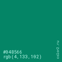 Цвет #048566 в цветовой модели RGB обозначается тремя октетами (4, 133, 102) в десятичном формате и #048566 в шестнадцатиричном (hex) формате, которые являются интенсивностью красного 4 (hex 04), интенсивность зелёного 133 (hex 85) и интенсивность синего 102 (hex 66).