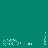 Цвет #04876E в цветовой модели RGB обозначается тремя октетами (4, 135, 110) в десятичном формате и #04876E в шестнадцатиричном (hex) формате, которые являются интенсивностью красного 4 (hex 04), интенсивность зелёного 135 (hex 87) и интенсивность синего 110 (hex 6E).