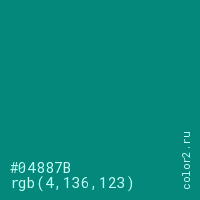 Цвет #04887B в цветовой модели RGB обозначается тремя октетами (4, 136, 123) в десятичном формате и #04887B в шестнадцатиричном (hex) формате, которые являются интенсивностью красного 4 (hex 04), интенсивность зелёного 136 (hex 88) и интенсивность синего 123 (hex 7B).