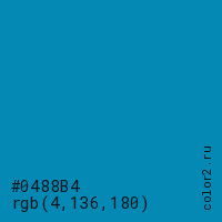 Цвет #0488B4 в цветовой модели RGB обозначается тремя октетами (4, 136, 180) в десятичном формате и #0488B4 в шестнадцатиричном (hex) формате, которые являются интенсивностью красного 4 (hex 04), интенсивность зелёного 136 (hex 88) и интенсивность синего 180 (hex B4).