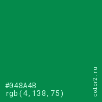 Цвет #048A4B в цветовой модели RGB обозначается тремя октетами (4, 138, 75) в десятичном формате и #048A4B в шестнадцатиричном (hex) формате, которые являются интенсивностью красного 4 (hex 04), интенсивность зелёного 138 (hex 8A) и интенсивность синего 75 (hex 4B).