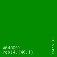 Цвет #048C01 в цветовой модели RGB обозначается тремя октетами (4, 140, 1) в десятичном формате и #048C01 в шестнадцатиричном (hex) формате, которые являются интенсивностью красного 4 (hex 04), интенсивность зелёного 140 (hex 8C) и интенсивность синего 1 (hex 01).