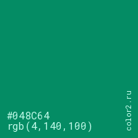 Цвет #048C64 в цветовой модели RGB обозначается тремя октетами (4, 140, 100) в десятичном формате и #048C64 в шестнадцатиричном (hex) формате, которые являются интенсивностью красного 4 (hex 04), интенсивность зелёного 140 (hex 8C) и интенсивность синего 100 (hex 64).