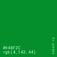 Цвет #048F2C в цветовой модели RGB обозначается тремя октетами (4, 143, 44) в десятичном формате и #048F2C в шестнадцатиричном (hex) формате, которые являются интенсивностью красного 4 (hex 04), интенсивность зелёного 143 (hex 8F) и интенсивность синего 44 (hex 2C).
