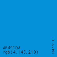 Цвет #0491DA в цветовой модели RGB обозначается тремя октетами (4, 145, 218) в десятичном формате и #0491DA в шестнадцатиричном (hex) формате, которые являются интенсивностью красного 4 (hex 04), интенсивность зелёного 145 (hex 91) и интенсивность синего 218 (hex DA).