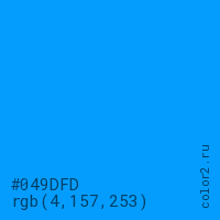 Цвет #049DFD в цветовой модели RGB обозначается тремя октетами (4, 157, 253) в десятичном формате и #049DFD в шестнадцатиричном (hex) формате, которые являются интенсивностью красного 4 (hex 04), интенсивность зелёного 157 (hex 9D) и интенсивность синего 253 (hex FD).