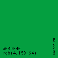 Цвет #049F40 в цветовой модели RGB обозначается тремя октетами (4, 159, 64) в десятичном формате и #049F40 в шестнадцатиричном (hex) формате, которые являются интенсивностью красного 4 (hex 04), интенсивность зелёного 159 (hex 9F) и интенсивность синего 64 (hex 40).