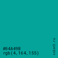 Цвет #04A49B в цветовой модели RGB обозначается тремя октетами (4, 164, 155) в десятичном формате и #04A49B в шестнадцатиричном (hex) формате, которые являются интенсивностью красного 4 (hex 04), интенсивность зелёного 164 (hex A4) и интенсивность синего 155 (hex 9B).