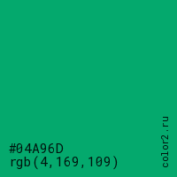 Цвет #04A96D в цветовой модели RGB обозначается тремя октетами (4, 169, 109) в десятичном формате и #04A96D в шестнадцатиричном (hex) формате, которые являются интенсивностью красного 4 (hex 04), интенсивность зелёного 169 (hex A9) и интенсивность синего 109 (hex 6D).