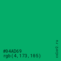 Цвет #04AD69 в цветовой модели RGB обозначается тремя октетами (4, 173, 105) в десятичном формате и #04AD69 в шестнадцатиричном (hex) формате, которые являются интенсивностью красного 4 (hex 04), интенсивность зелёного 173 (hex AD) и интенсивность синего 105 (hex 69).