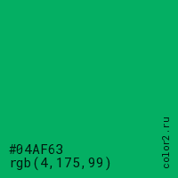 Цвет #04AF63 в цветовой модели RGB обозначается тремя октетами (4, 175, 99) в десятичном формате и #04AF63 в шестнадцатиричном (hex) формате, которые являются интенсивностью красного 4 (hex 04), интенсивность зелёного 175 (hex AF) и интенсивность синего 99 (hex 63).