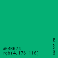 Цвет #04B074 в цветовой модели RGB обозначается тремя октетами (4, 176, 116) в десятичном формате и #04B074 в шестнадцатиричном (hex) формате, которые являются интенсивностью красного 4 (hex 04), интенсивность зелёного 176 (hex B0) и интенсивность синего 116 (hex 74).