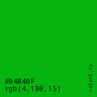 Цвет #04B40F в цветовой модели RGB обозначается тремя октетами (4, 180, 15) в десятичном формате и #04B40F в шестнадцатиричном (hex) формате, которые являются интенсивностью красного 4 (hex 04), интенсивность зелёного 180 (hex B4) и интенсивность синего 15 (hex 0F).
