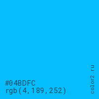 Цвет #04BDFC в цветовой модели RGB обозначается тремя октетами (4, 189, 252) в десятичном формате и #04BDFC в шестнадцатиричном (hex) формате, которые являются интенсивностью красного 4 (hex 04), интенсивность зелёного 189 (hex BD) и интенсивность синего 252 (hex FC).