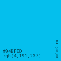 Цвет #04BFED в цветовой модели RGB обозначается тремя октетами (4, 191, 237) в десятичном формате и #04BFED в шестнадцатиричном (hex) формате, которые являются интенсивностью красного 4 (hex 04), интенсивность зелёного 191 (hex BF) и интенсивность синего 237 (hex ED).