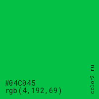 Цвет #04C045 в цветовой модели RGB обозначается тремя октетами (4, 192, 69) в десятичном формате и #04C045 в шестнадцатиричном (hex) формате, которые являются интенсивностью красного 4 (hex 04), интенсивность зелёного 192 (hex C0) и интенсивность синего 69 (hex 45).