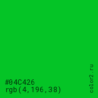 Цвет #04C426 в цветовой модели RGB обозначается тремя октетами (4, 196, 38) в десятичном формате и #04C426 в шестнадцатиричном (hex) формате, которые являются интенсивностью красного 4 (hex 04), интенсивность зелёного 196 (hex C4) и интенсивность синего 38 (hex 26).