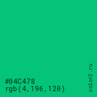 Цвет #04C478 в цветовой модели RGB обозначается тремя октетами (4, 196, 120) в десятичном формате и #04C478 в шестнадцатиричном (hex) формате, которые являются интенсивностью красного 4 (hex 04), интенсивность зелёного 196 (hex C4) и интенсивность синего 120 (hex 78).