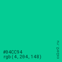 Цвет #04CC94 в цветовой модели RGB обозначается тремя октетами (4, 204, 148) в десятичном формате и #04CC94 в шестнадцатиричном (hex) формате, которые являются интенсивностью красного 4 (hex 04), интенсивность зелёного 204 (hex CC) и интенсивность синего 148 (hex 94).
