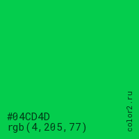 Цвет #04CD4D в цветовой модели RGB обозначается тремя октетами (4, 205, 77) в десятичном формате и #04CD4D в шестнадцатиричном (hex) формате, которые являются интенсивностью красного 4 (hex 04), интенсивность зелёного 205 (hex CD) и интенсивность синего 77 (hex 4D).