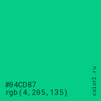 Цвет #04CD87 в цветовой модели RGB обозначается тремя октетами (4, 205, 135) в десятичном формате и #04CD87 в шестнадцатиричном (hex) формате, которые являются интенсивностью красного 4 (hex 04), интенсивность зелёного 205 (hex CD) и интенсивность синего 135 (hex 87).