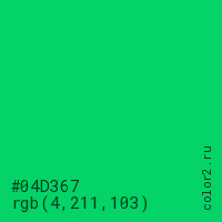 Цвет #04D367 в цветовой модели RGB обозначается тремя октетами (4, 211, 103) в десятичном формате и #04D367 в шестнадцатиричном (hex) формате, которые являются интенсивностью красного 4 (hex 04), интенсивность зелёного 211 (hex D3) и интенсивность синего 103 (hex 67).