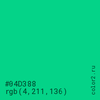 Цвет #04D388 в цветовой модели RGB обозначается тремя октетами (4, 211, 136) в десятичном формате и #04D388 в шестнадцатиричном (hex) формате, которые являются интенсивностью красного 4 (hex 04), интенсивность зелёного 211 (hex D3) и интенсивность синего 136 (hex 88).