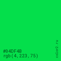 Цвет #04DF4B в цветовой модели RGB обозначается тремя октетами (4, 223, 75) в десятичном формате и #04DF4B в шестнадцатиричном (hex) формате, которые являются интенсивностью красного 4 (hex 04), интенсивность зелёного 223 (hex DF) и интенсивность синего 75 (hex 4B).