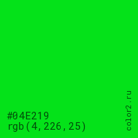 Цвет #04E219 в цветовой модели RGB обозначается тремя октетами (4, 226, 25) в десятичном формате и #04E219 в шестнадцатиричном (hex) формате, которые являются интенсивностью красного 4 (hex 04), интенсивность зелёного 226 (hex E2) и интенсивность синего 25 (hex 19).
