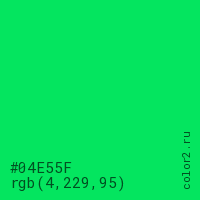 Цвет #04E55F в цветовой модели RGB обозначается тремя октетами (4, 229, 95) в десятичном формате и #04E55F в шестнадцатиричном (hex) формате, которые являются интенсивностью красного 4 (hex 04), интенсивность зелёного 229 (hex E5) и интенсивность синего 95 (hex 5F).