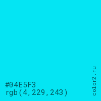 Цвет #04E5F3 в цветовой модели RGB обозначается тремя октетами (4, 229, 243) в десятичном формате и #04E5F3 в шестнадцатиричном (hex) формате, которые являются интенсивностью красного 4 (hex 04), интенсивность зелёного 229 (hex E5) и интенсивность синего 243 (hex F3).