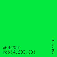 Цвет #04E93F в цветовой модели RGB обозначается тремя октетами (4, 233, 63) в десятичном формате и #04E93F в шестнадцатиричном (hex) формате, которые являются интенсивностью красного 4 (hex 04), интенсивность зелёного 233 (hex E9) и интенсивность синего 63 (hex 3F).