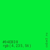 Цвет #04EB38 в цветовой модели RGB обозначается тремя октетами (4, 235, 56) в десятичном формате и #04EB38 в шестнадцатиричном (hex) формате, которые являются интенсивностью красного 4 (hex 04), интенсивность зелёного 235 (hex EB) и интенсивность синего 56 (hex 38).
