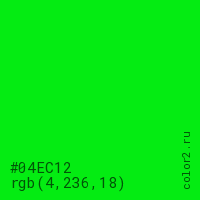 Цвет #04EC12 в цветовой модели RGB обозначается тремя октетами (4, 236, 18) в десятичном формате и #04EC12 в шестнадцатиричном (hex) формате, которые являются интенсивностью красного 4 (hex 04), интенсивность зелёного 236 (hex EC) и интенсивность синего 18 (hex 12).