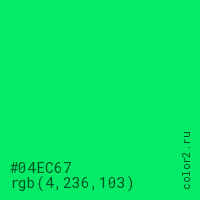 Цвет #04EC67 в цветовой модели RGB обозначается тремя октетами (4, 236, 103) в десятичном формате и #04EC67 в шестнадцатиричном (hex) формате, которые являются интенсивностью красного 4 (hex 04), интенсивность зелёного 236 (hex EC) и интенсивность синего 103 (hex 67).