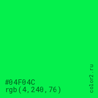 Цвет #04F04C в цветовой модели RGB обозначается тремя октетами (4, 240, 76) в десятичном формате и #04F04C в шестнадцатиричном (hex) формате, которые являются интенсивностью красного 4 (hex 04), интенсивность зелёного 240 (hex F0) и интенсивность синего 76 (hex 4C).