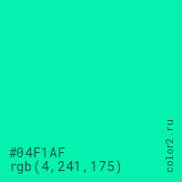 Цвет #04F1AF в цветовой модели RGB обозначается тремя октетами (4, 241, 175) в десятичном формате и #04F1AF в шестнадцатиричном (hex) формате, которые являются интенсивностью красного 4 (hex 04), интенсивность зелёного 241 (hex F1) и интенсивность синего 175 (hex AF).