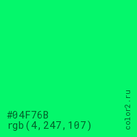 Цвет #04F76B в цветовой модели RGB обозначается тремя октетами (4, 247, 107) в десятичном формате и #04F76B в шестнадцатиричном (hex) формате, которые являются интенсивностью красного 4 (hex 04), интенсивность зелёного 247 (hex F7) и интенсивность синего 107 (hex 6B).