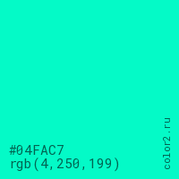 Цвет #04FAC7 в цветовой модели RGB обозначается тремя октетами (4, 250, 199) в десятичном формате и #04FAC7 в шестнадцатиричном (hex) формате, которые являются интенсивностью красного 4 (hex 04), интенсивность зелёного 250 (hex FA) и интенсивность синего 199 (hex C7).